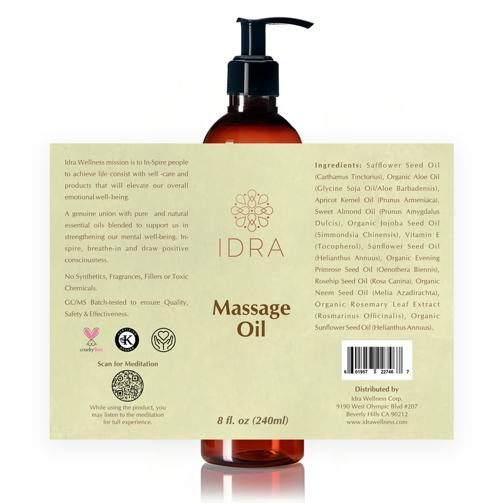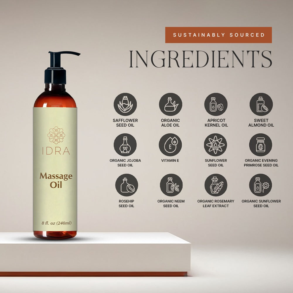 Idra Massage Oils with soothing essential oil blends helping you to unwind and de-stress. Skin Nourishment - great as a body oil.